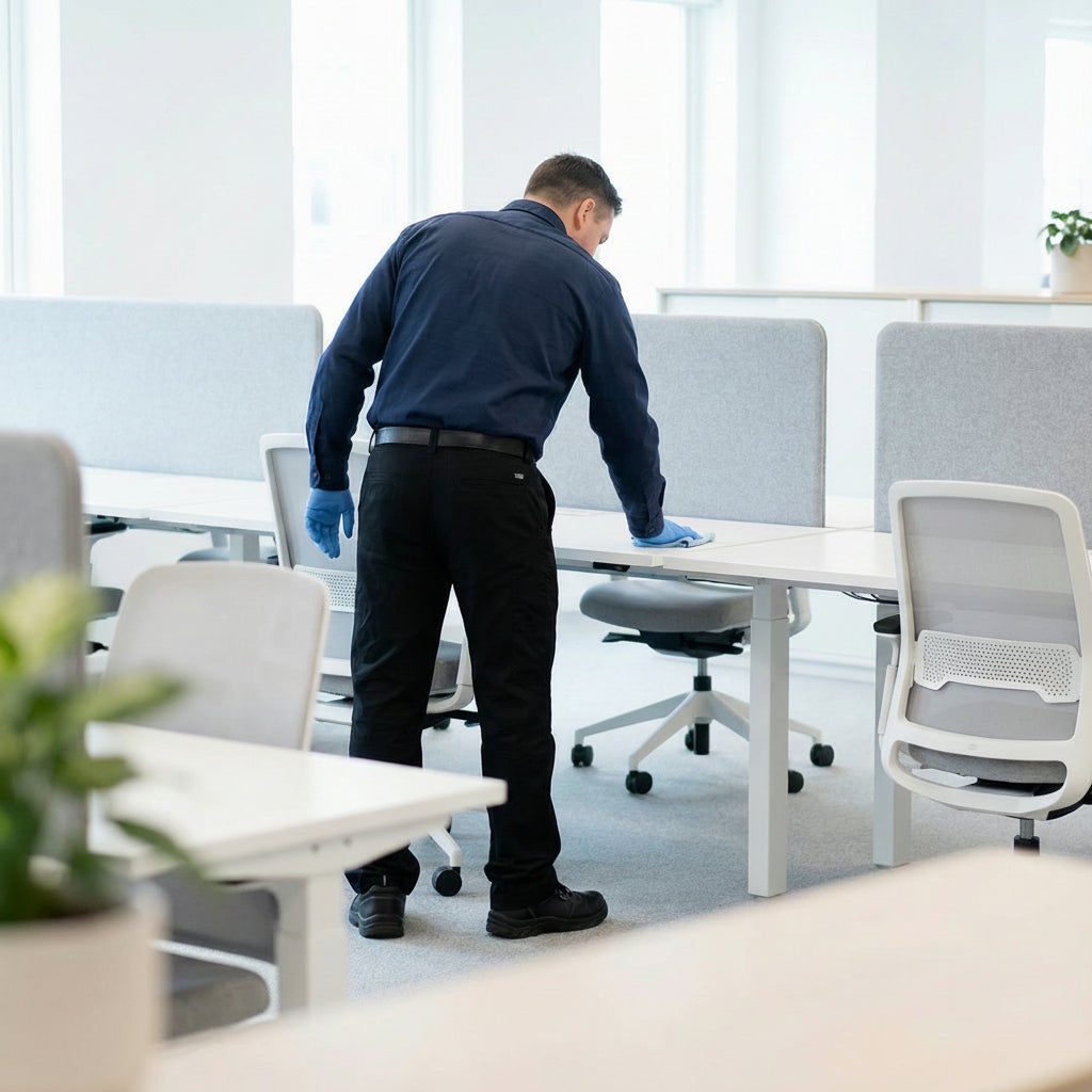 Careful cleaning of desks and work surfaces while respecting personal items, equipment, and workspace layouts.