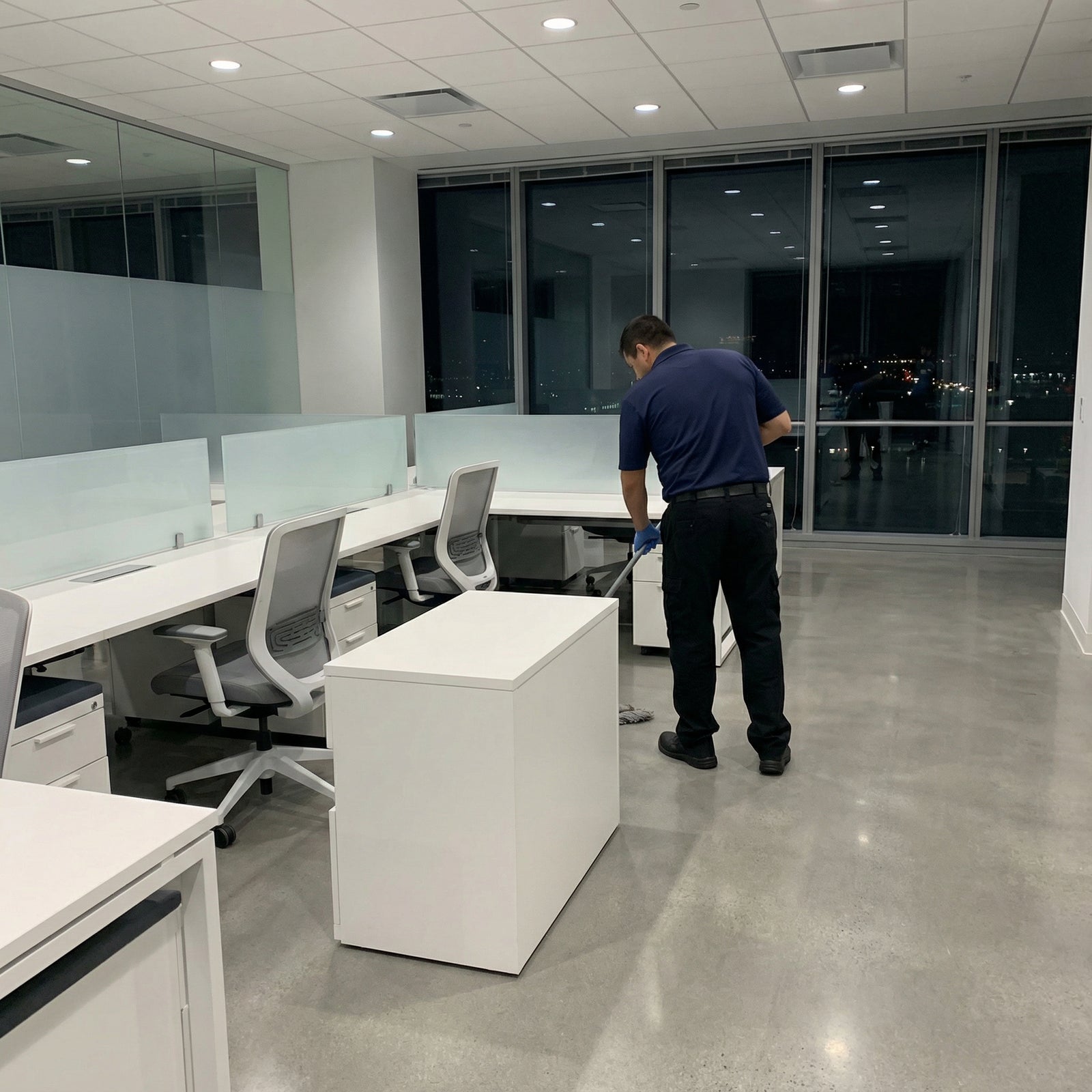 After business hours, supervised cleaning is provided for sensitive office environments to ensure controlled access, confidentiality, and scope compliance. A designated on-site manager remains present throughout service to oversee cleaning activity in staff-only areas containing sensitive documents, shared workstations, printers, and file storage.